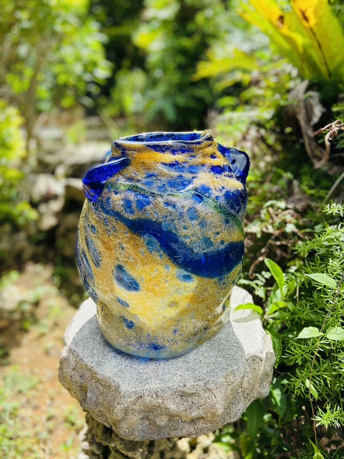 Seiichiro Inamine is the second generation master craftsman of the glasswork studio Ryukyu Inamine Glass in Okinawa, founded by his father Moriyoshi Inamine. Moriyoshi Inamine was a leading figure in Ryukyu glass art and a contemporary master craftsman, who developed a signature technique and style including the foamed glassware and vessels with soil textures. The form and colors of the glassware reflects the vivid and lush sceneries of Yomitan, Okinawa. Inamine continuously experiments with materials, both organic and inorganic, such as coral, sugar, charcoal, aluminum, etc. to push the possibilities of the colors and textures in creating foam glass.